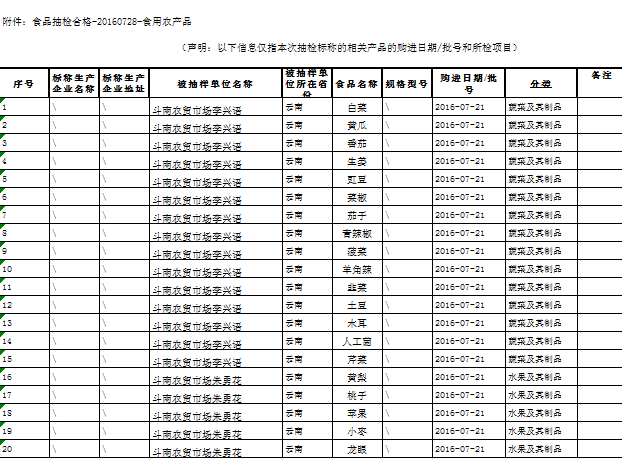 附件:食品抽检合格-20160728-食用农产品