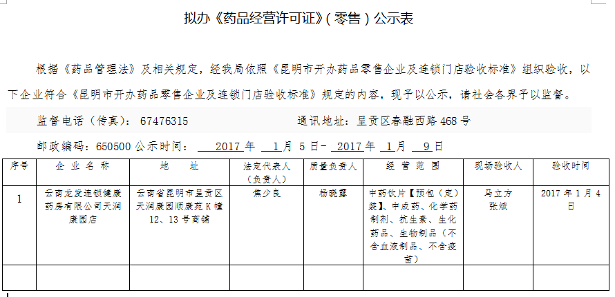 药品经营许可证 零售 公示 云南 龙发