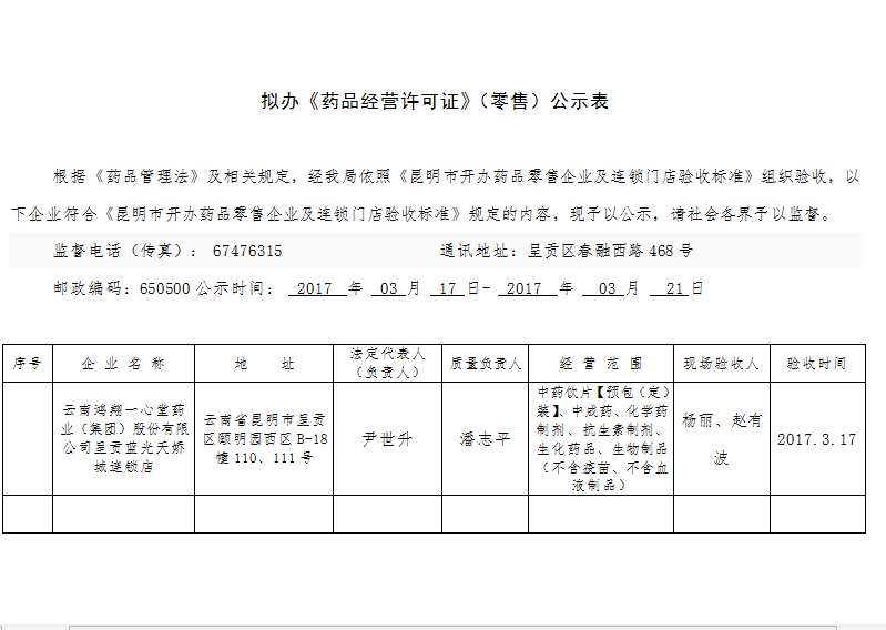 《药品经营许可证》(零售)公示:云南鸿翔一心堂药业(集团)股份有限公司呈贡蓝光天娇城连锁店