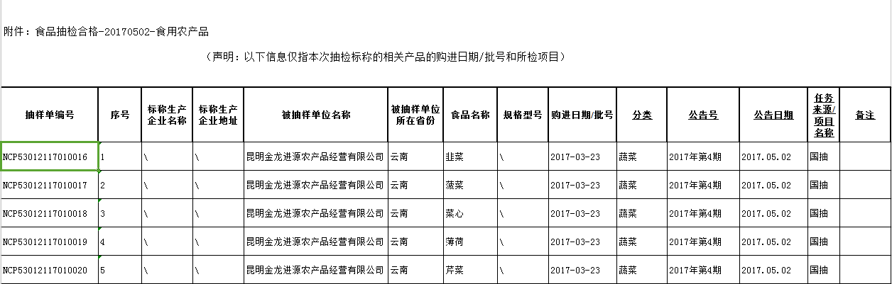 (截图)昆明市呈贡区市场监督管理局2017年第4期食品安全监督抽检信息公告