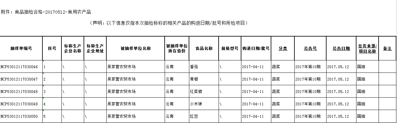本期公布的食品安全监督抽检产品为:食用农产品,抽检依据GB 2763-2014《食品安全国家标准 食品中农药最大残留限量》等标准要求。抽检项目包括克百威、氧乐果、甲胺磷、阿维菌素、氯氰菊酯和高效氯氰菊酯、乐果等指标。公告抽检合格样品5批次,合格率100%。