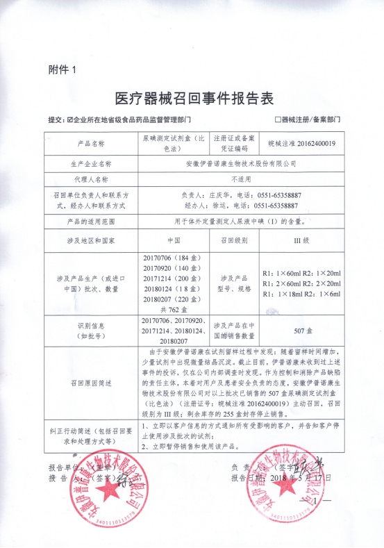 安徽伊普诺康生物技术股份有限公司报告,由于安徽伊普诺康在试剂留样过程中发现:随着留样时间增加,少量试剂中出现微量结晶沉淀。截止目前,伊普诺康未收到过上述事件的投诉,仅在公司内部调查时发现。作为控制和消除产品缺陷的责任主体,本着对用户及患者安全负责的态度,安徽伊普诺康生物技术股份有限公司对其生产的尿碘测定试剂盒(比色法)(注册证号:皖械注准20162400019)主动召回,召回级别为III级。涉及产品的型号、规格及批次等详细信息见《医疗器械召回事件报告表》。