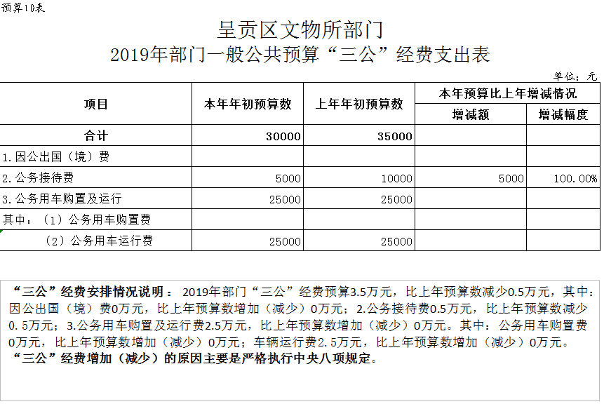 2019年部门“三公”经费预算3万元,比上年预算数减少0.5万元,分别为:1.因公出国(境)费0万元,比上年预算数增加(减少)0万元;2.公务接待费0.5万元,比上年预算数减少0.5万元;3.公务用车购置及运行费2.5万元,其中:公务用车购置0万元,比上年预算数增加(减少)0万元;公务用车运行费2.5万元,比上年预算数增加(减少)0万元。