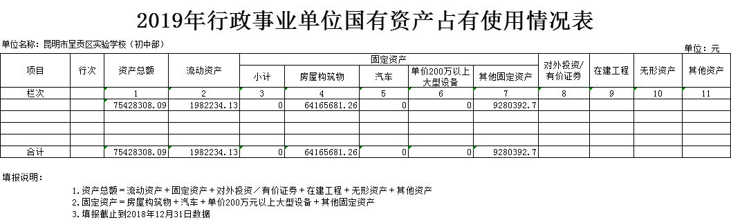 截止2018年12月31日昆明市呈贡区实验学校(初中部)国有资产占有使用情况详情见下图: