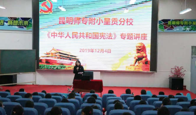 活动中,呈贡区司法局龙城司法所所长杨云萍为学校四至六年级200余名师生进行了《中华人民共和国宪法》专题讲座,杨所长结合宪法的概念、性质和地位讲述了宪法的基本内容及修订历史,要求学校全体师生切实强化知法、懂法、守法意识,不断提升法治素养,努力营造良好的法治教育环境。