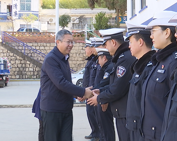 慰问组一行向昆明市交警支队五大队的值班干警致以诚挚的问候,对干警及其家属表示感谢,希望春节期间,各位干警要坚守岗位,确保群众能够过一个平安的春节,希望干警们在紧张工作的同时有一个温馨的春节。