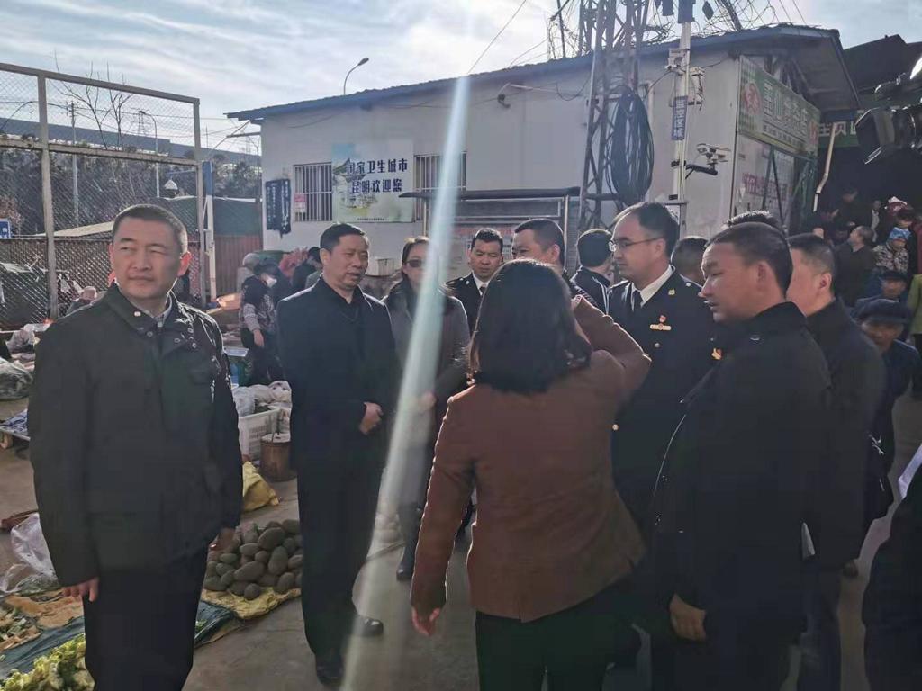 1月20日上午,呈贡政协主席杨绍斌率队到吴家营幸福小区农贸市场就年前市场监管工作情况进行调研,区委统战部部长潘劲、吴家营街道主任李亚楠陪同调研。