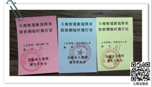 “三色卡”全称为“斗南街道新冠肺炎防控期临时通行证”,是斗南街道特别为方便疫情期间外来流动人员准备的出入证明。
