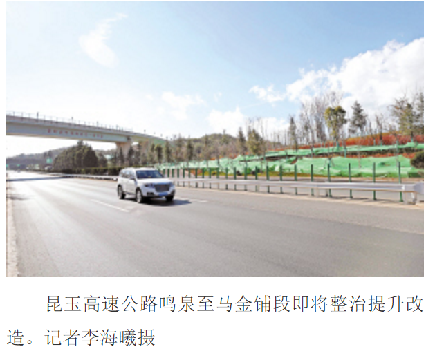 施工期间,昆明主城至呈贡、玉溪方向保留2条车道通行,玉溪、呈贡至昆明主城方向保留1条车道通行;施工路段沿线9座立交38个进出口封闭22个,保留16个。  病害严重亟待提升改造  昆玉高速公路鸣泉至马金铺段整治提升改造工程建设指挥部常务副指挥长彭伟介绍,昆玉高速于1999年4月17日建成通车,起于昆明市小板桥鸣泉村,止于玉溪市红塔区高仓村,全长85.71公里,是昆明市连接滇南方向的重要通道,也是昆明主城区通往呈贡区的第一快速通道。建成通车后,由昆玉高速公路开发有限公司进行运营管理。2017年7月15日24时,鸣泉至马金铺段取消收费,同时该段道路移交昆明市进行养护管理。  近年来,随着社会经济发展,交通出行需求大幅增加,昆玉高速承载着巨大的交通压力,特别是鸣泉至马金铺段免费通行后,车流大幅增加,交通通行压力尤为明显。据测算,2019年末,该段道路交通量接近10万辆/天,高峰小时交通量超过8000辆,远远超过原6万辆/天的设计标准。同时,鸣泉至马金铺段沿线货运场站集中,货车比例高,超限超载时有发生,加之该段道路穿越城市建成区,桥涵较多,管养维修难度较大等,致使道路出现路面龟裂、沉陷、坑槽、桥涵裂缝等病害,严重影响行车舒适性和安全性。  据悉,该段高速公路自建成20年来未进行过路面大修,根据公路现状病害实际,按照高速公路路面大修和危桥改造相关规范要求,为较为彻底、全面消除病害,根据工作安排部署,决定启动整治提升改造工程。  分幅施工先施工西半幅  本次实施的昆玉高速提升改造工程,起于经开区鸣泉立交,止于高新区马金铺立交,全长22.362公里。整治提升改造的内容主要包括路面整治提升改造、桥涵维修加固、交安设施完善优化等。计划于3月20日22时正式动工,工期控制在100天,计划6月下旬完工。  昆玉高速是昆明主城区连接呈贡区最为便捷的快速通道,为了尽量降低施工对交通的影响,同时确保施工安全和质量,工程施工采取分幅施工、双向保通(2+1)模式组织实施。昆玉高速为双向6车道,即以中央绿化带为界,先施工西半幅(下行线),另外半幅3个车道双向保通,西半幅施工完毕后进行导改。  施工期间,昆明主城至呈贡玉溪方向(下行线)保留2条车道通行,玉溪呈贡至昆明主城方向(上行线)保留1条车道通行。  高位统筹强化组织保障