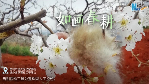 3月25日,村民用自制授粉工具为宝珠梨人工授粉。新华网发(呈贡区委宣传部 供图)