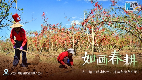 3月11日,大理州洱源县茈碧湖镇大庄村农户给木瓜地松土,并准备施有机肥。新华网发(洱源县融媒体中心 供图)