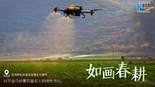 3月5日,红河州石屏县异龙镇豆地湾村对万亩马铃薯开展无人机绿色防控。新华网发(石屏县委宣传部 供图)