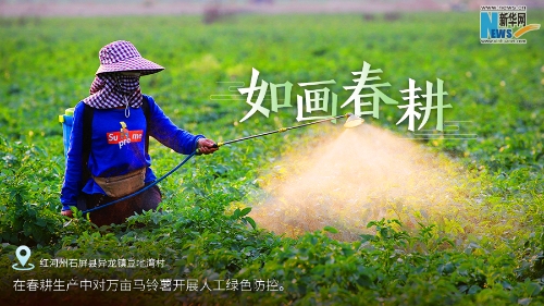 3月26日,红河州石屏县异龙镇豆地湾村在春耕生产中对万亩马铃薯开展人工绿色防控。新华网发(石屏县委宣传部 供图)