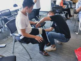 下午,在云南白药集团会议室进行实操。学员们以闭卷考的方式对早上老师讲解的内容进行考试。紧接着三位老师为学员们讲解多种止血包扎的方式,心肺复苏操作方法。学员们学的很用心,并认真演练。最后在老师的监督下,每位学员完成了止血包扎和心肺复苏的实操考核。
