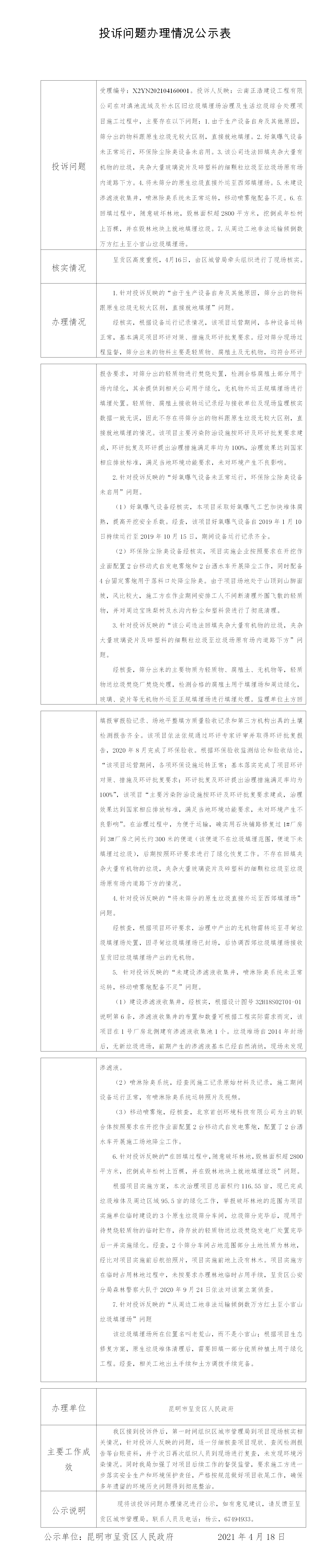 呈贡区中央第八环境保护督察组转办的X2YN202104160001号投诉问题办理情况公示表