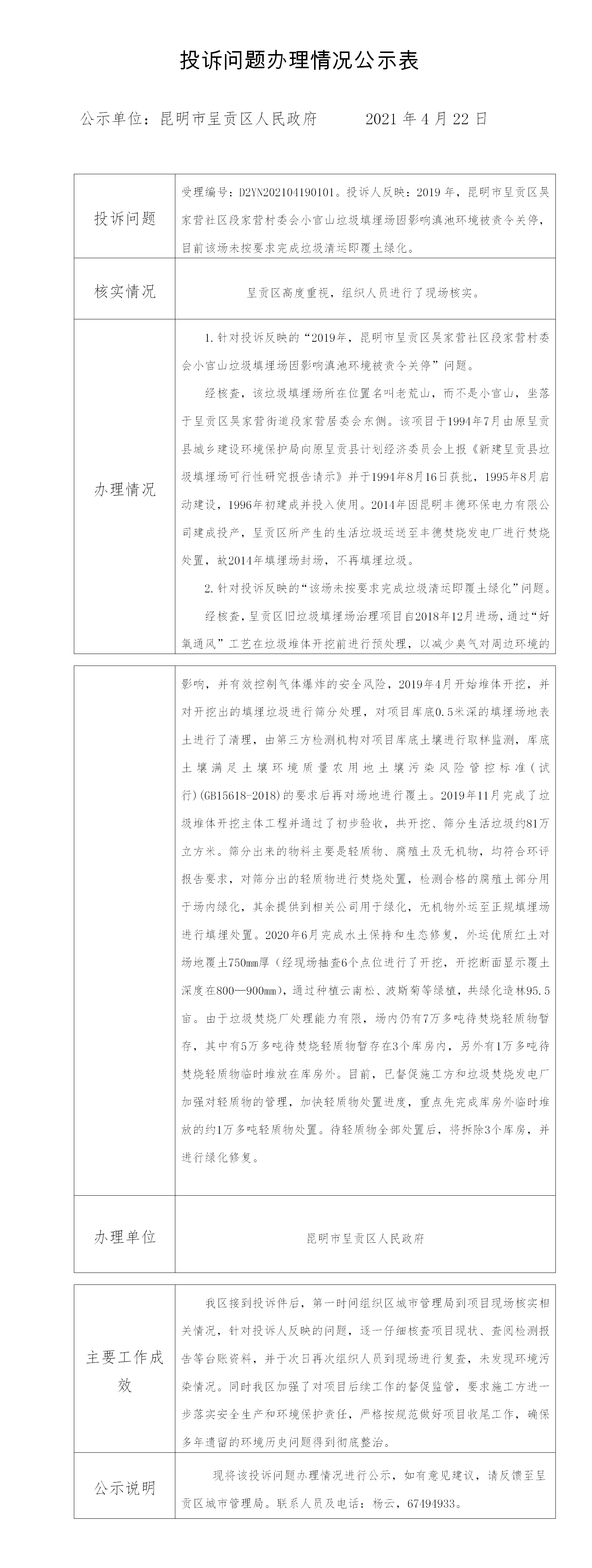 呈贡区中央第八环境保护督察组转办的D2YN202104190101号投诉问题办理情况公示表