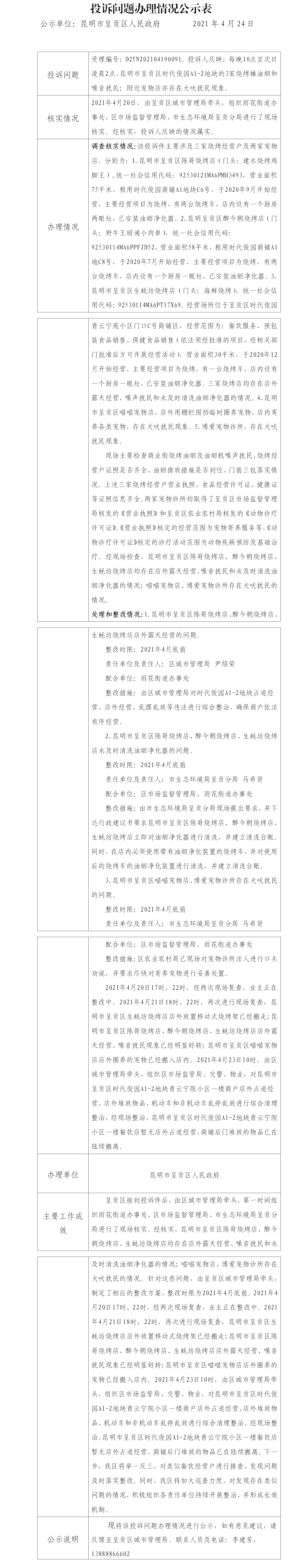 呈贡区中央第八环境保护督察组转办的D2YN202104190091号投诉问题办理情况公示表