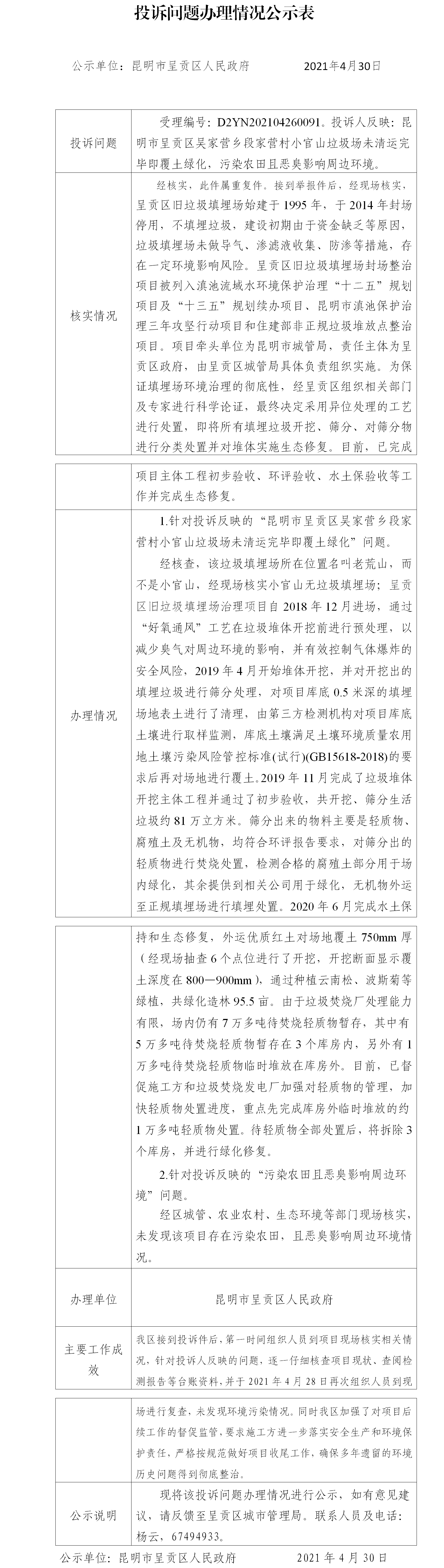 呈贡区中央第八环境保护督察组转办的D2YN202104260091号投诉问题办理情况公示表