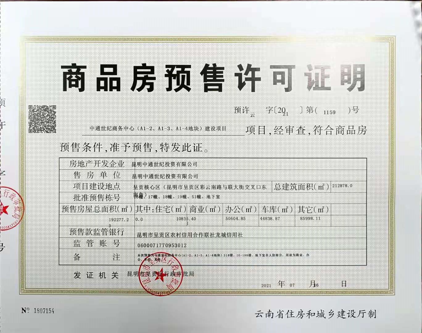 经审核,昆明市呈贡区行政审批局2021年7月16日已核发商品房预售许可证的建设项目向社会予以公示: