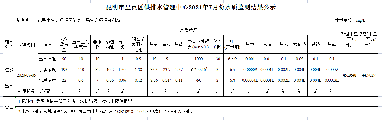 昆明市呈贡区供排水管理中心2021年7月份水质监测结果公示