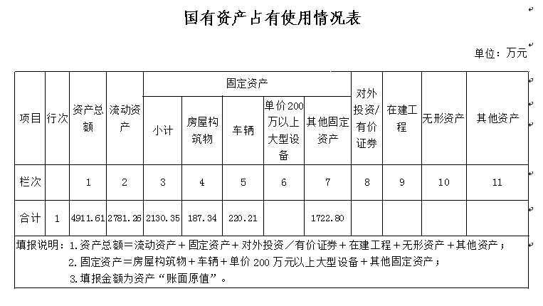 截至2020年12月31日,昆明市呈贡区水务局资产总额4911.61万元,其中,流动资产2,781.26万元,固定资产2,130.35万元,对外投资及有价证券0万元,在建工程0万元,无形资产0万元,其他资产0万元(具体内容详见附表)。与上年相比,本年资产总额减少4597.57万元,其中固定资产增加386.45万元。处置房屋建筑物0平方米,账面原值0万元;处置车辆0辆,账面原值0万元;报废报损资产0项,账面原值0万元,实现资产处置收入0万元;出租房屋0平方米,账面原值0万元,实现资产使用收入0万元。