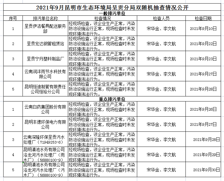 2021年9月昆明市生态环境局呈贡分局双随机抽查情况公开