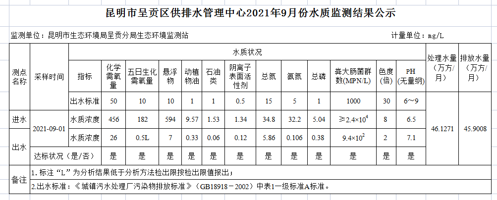 昆明市呈贡区供排水管理中心2021年9月份水质监测结果公示