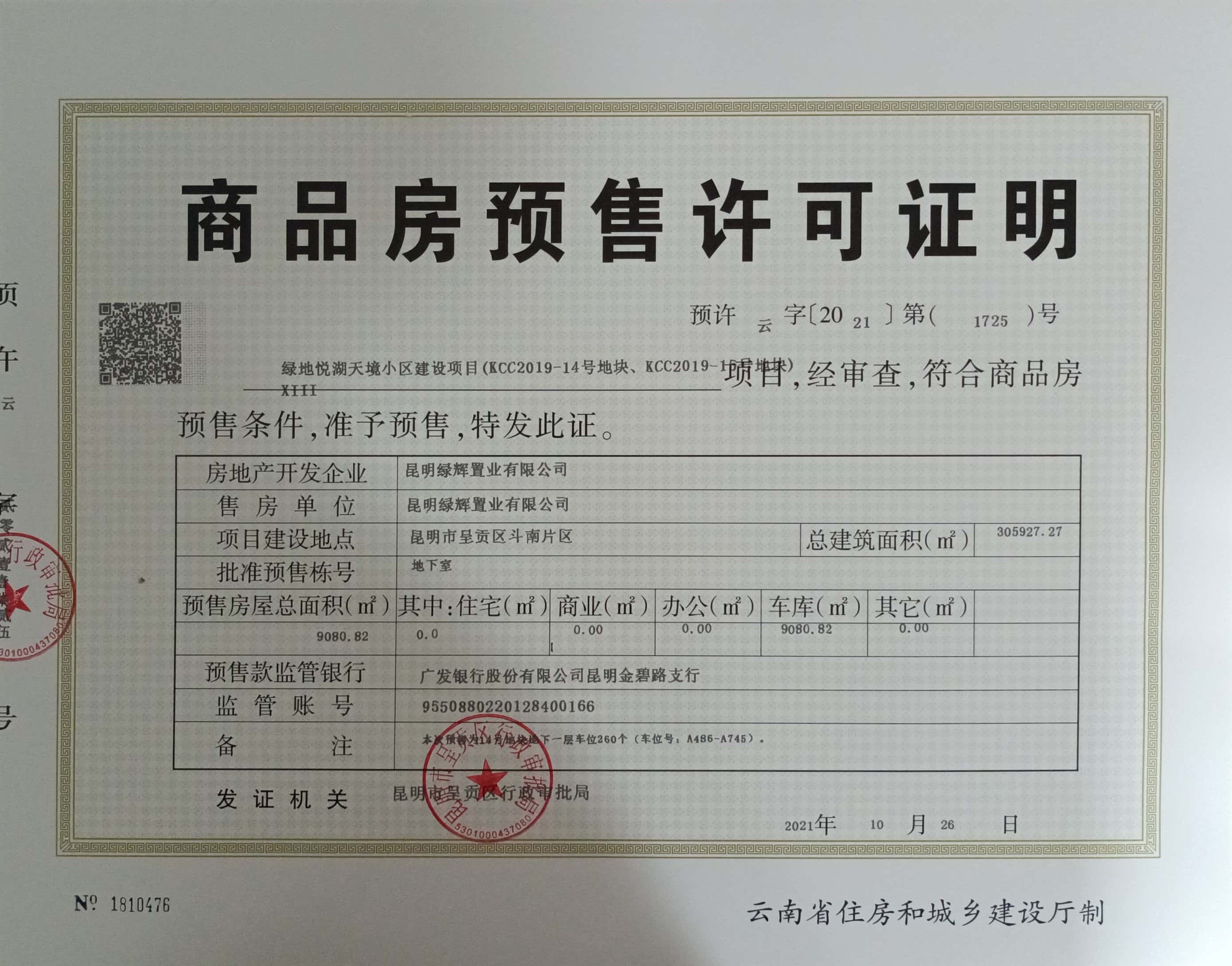 1.商品房预售项目名称及预售楼幢:绿地悦湖天境小区建设项目(KCC2019-14号地块、KCC2019-15号地块)XШ(预售14号地下室)