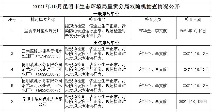 2021年10月昆明市生态环境局呈贡分局双随机抽查情况公开