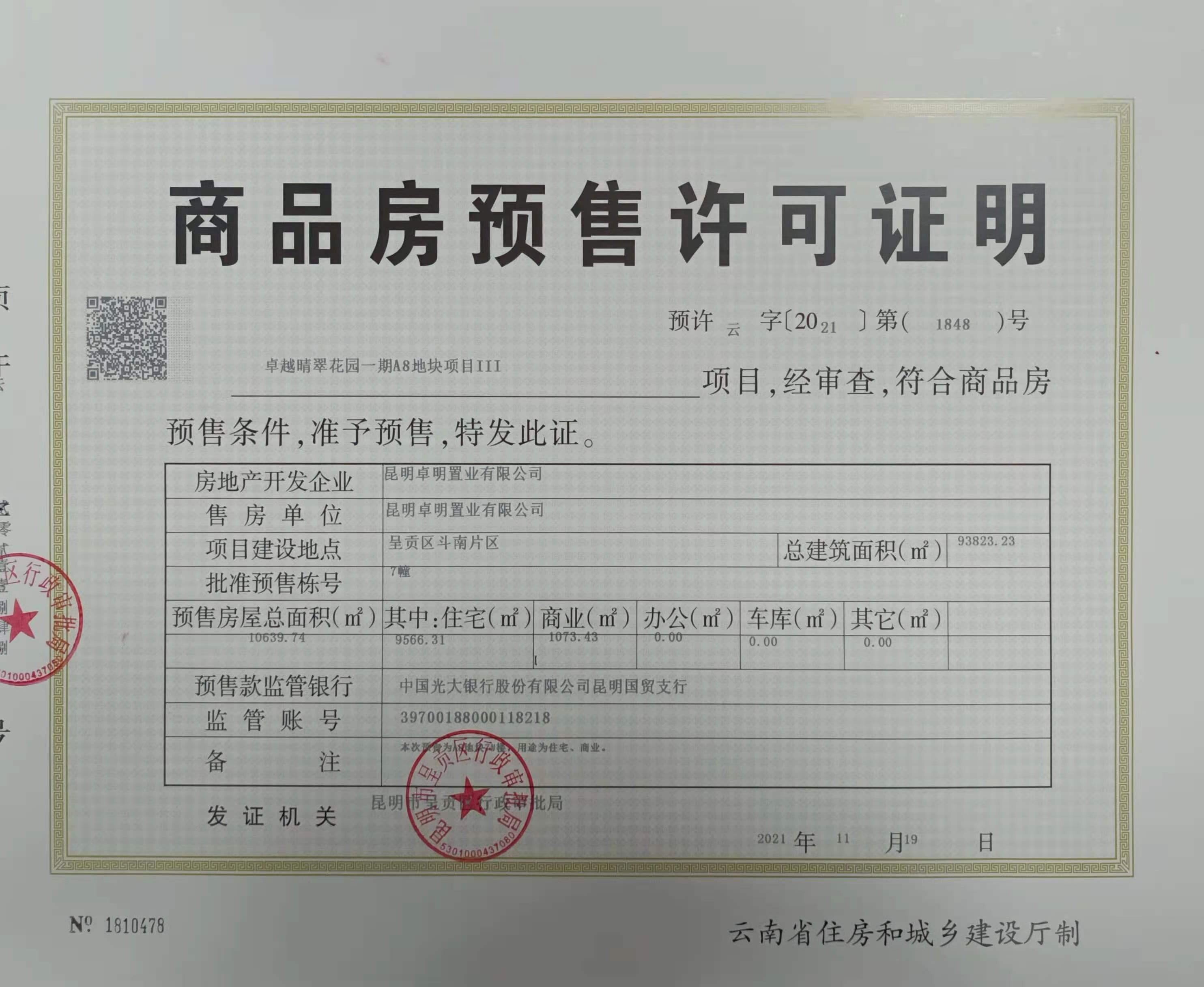 1.商品房预售项目名称及预售楼幢:卓越晴翠花园一期A8地块项目Ш(预售7幢)