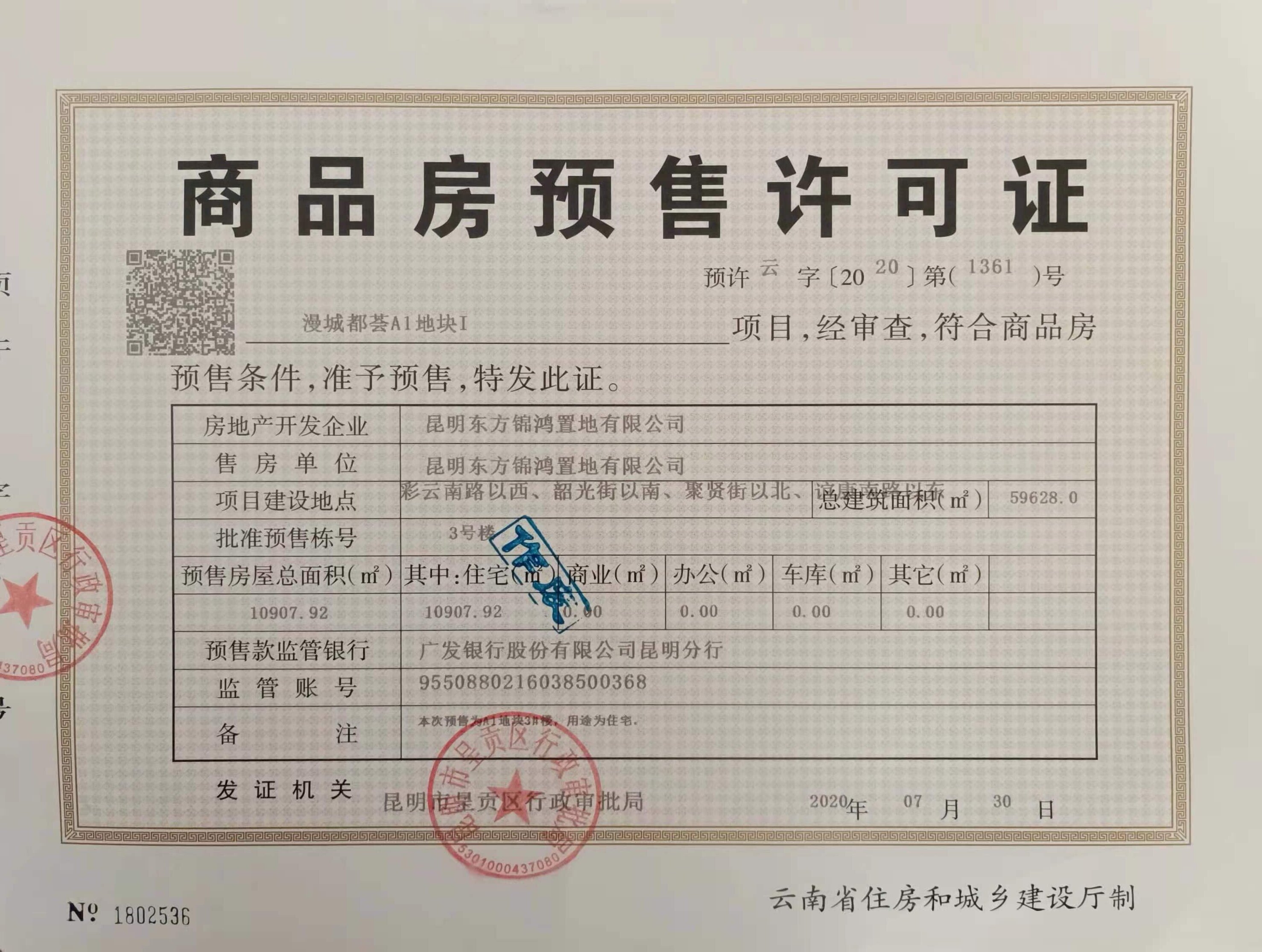 2.商品房预售项目名称及预售楼幢:漫城都荟A1地块Ⅰ,预售3幢。