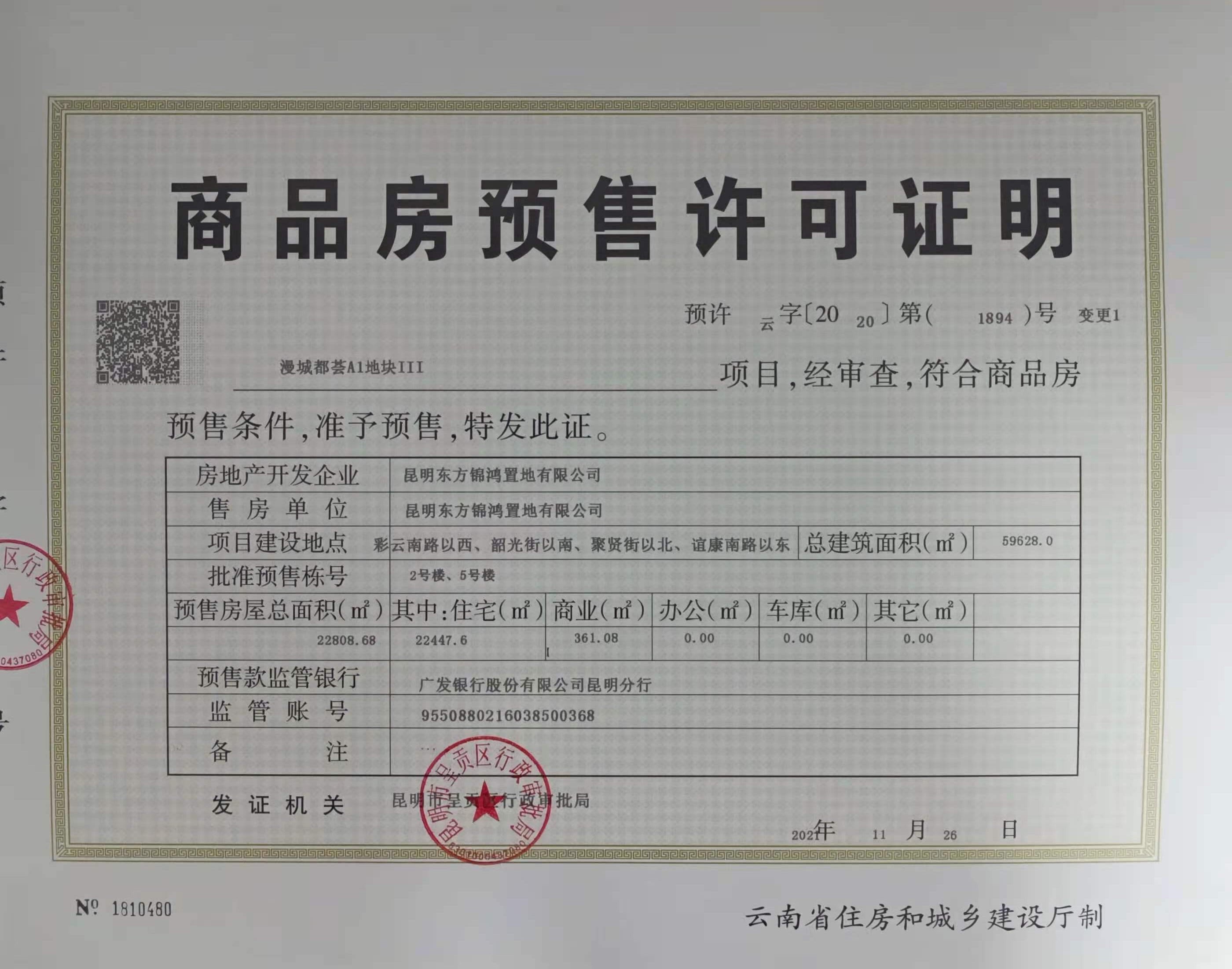 经审核,昆明市呈贡区行政审批局2021年11月26日已办理商品房预售许可证变更的建设项目向社会予以公示: