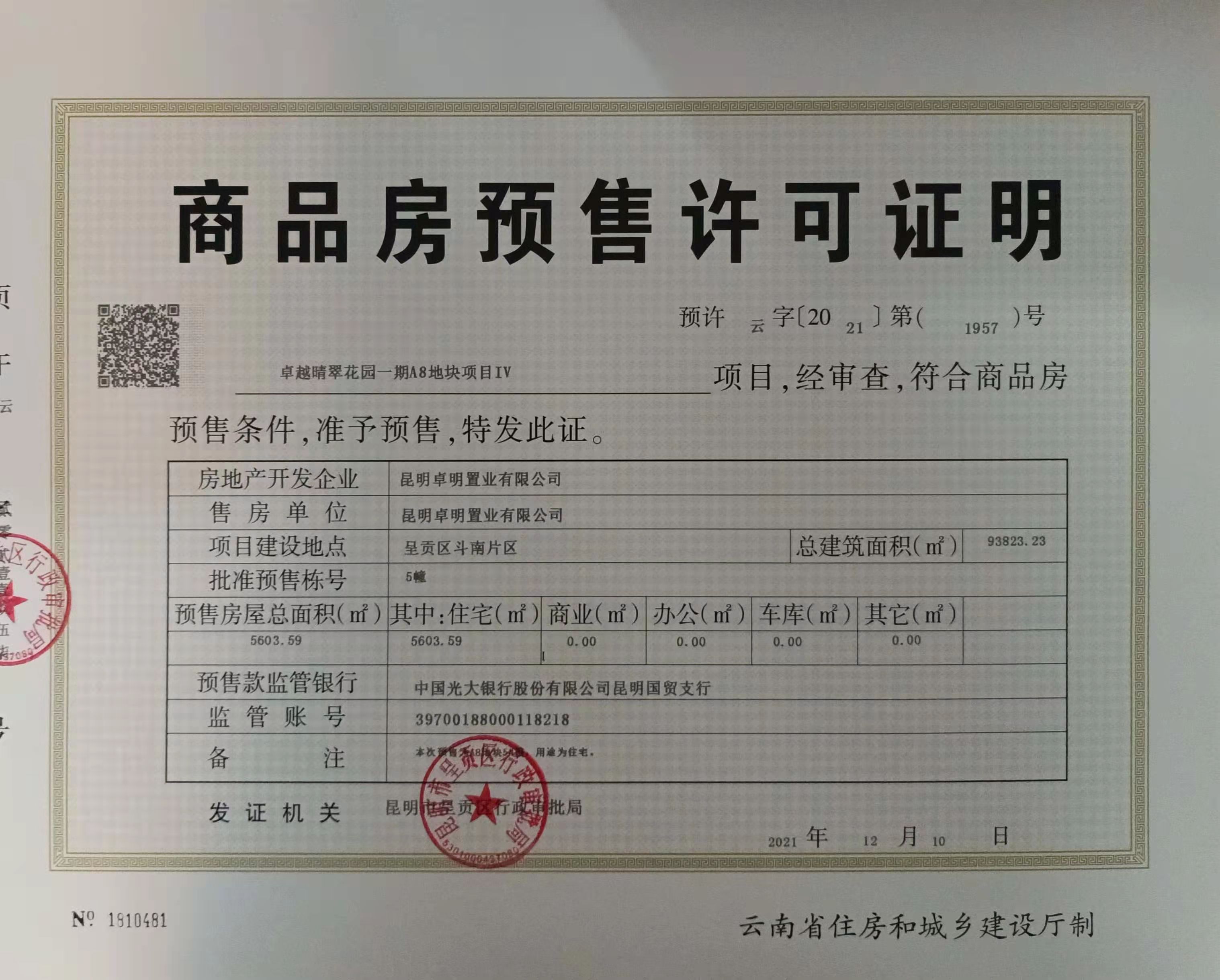 1.商品房预售项目名称及预售楼幢:卓越晴翠花园一期A8地块项目Ⅳ(预售5幢)
