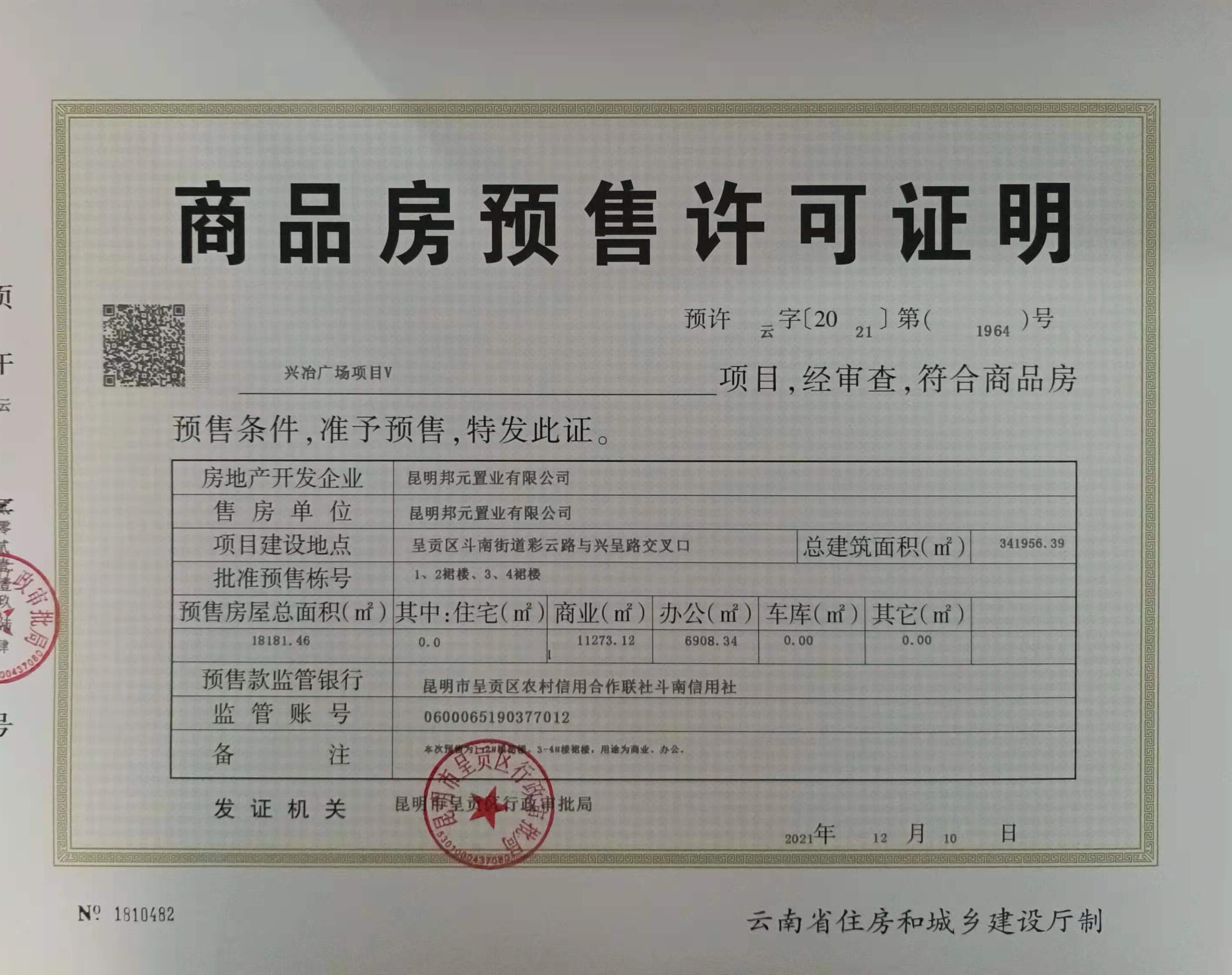 经审核,昆明市呈贡区行政审批局2021年12月10日已核发商品房预售许可证的建设项目向社会予以公示: