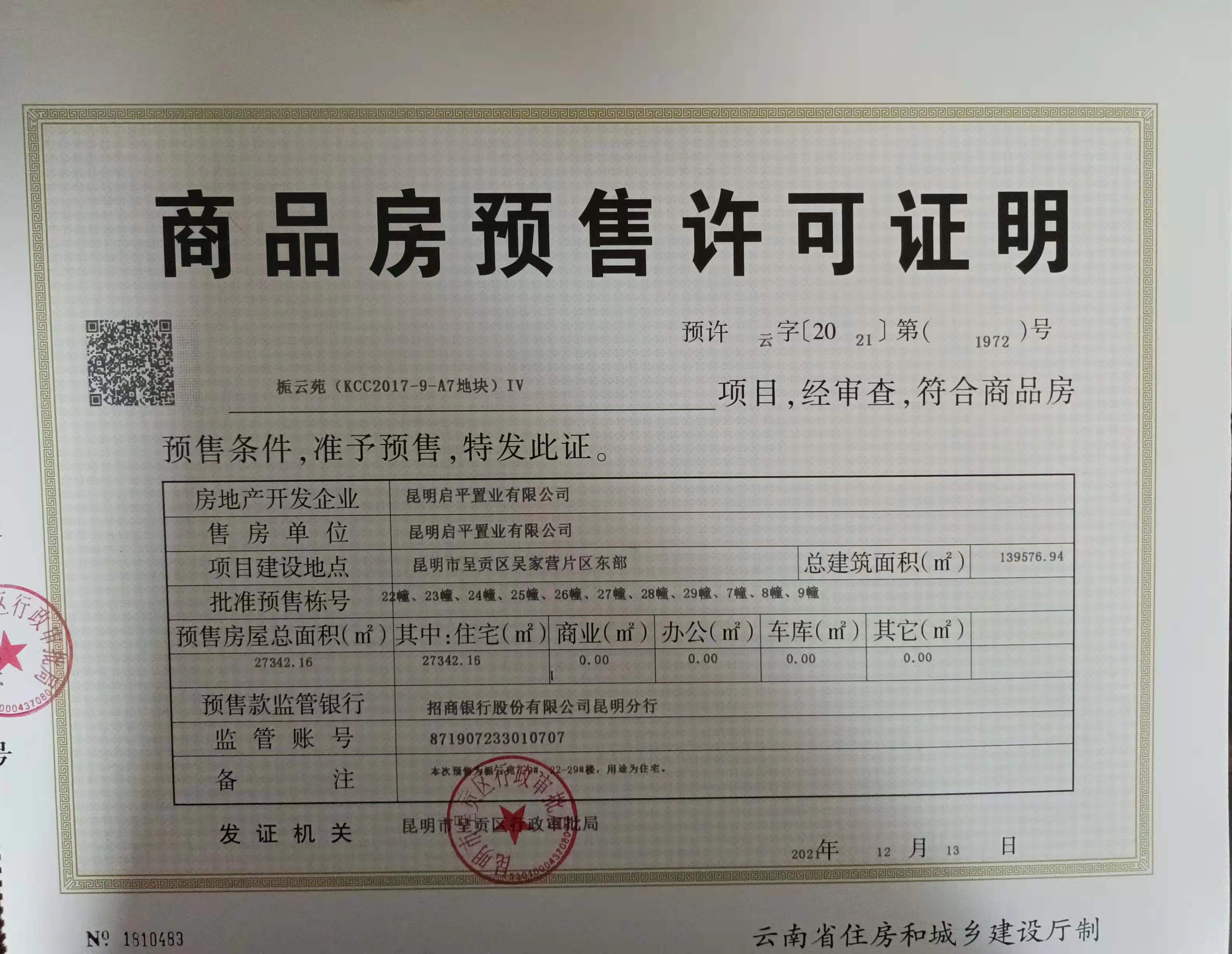 经审核,昆明市呈贡区行政审批局2021年12月13日已核发商品房预售许可证的建设项目向社会予以公示: