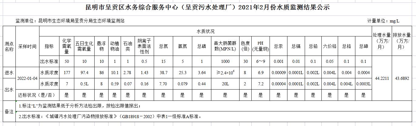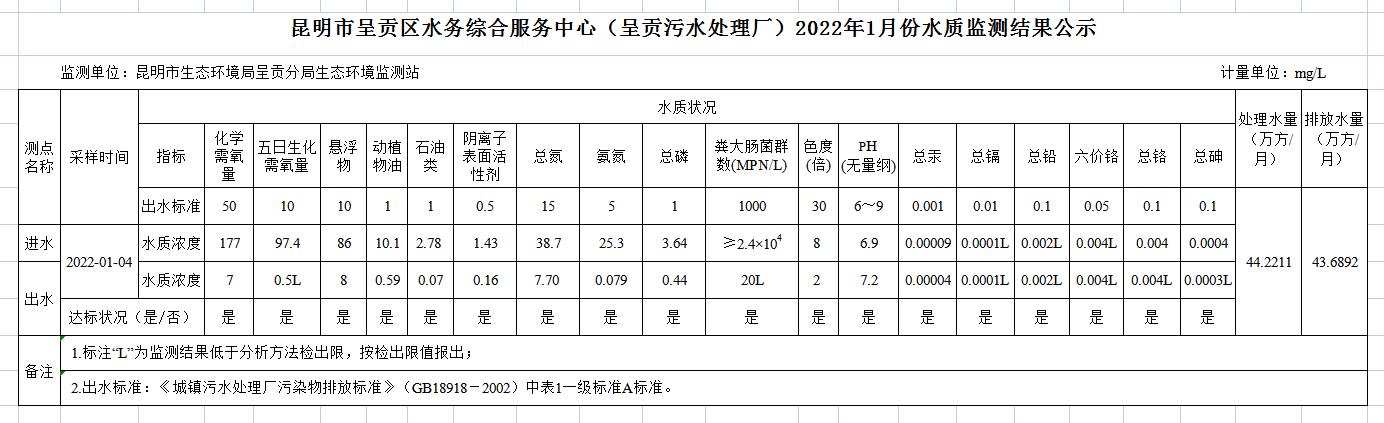 昆明市呈贡区水务综合服务中心(呈贡污水处理厂)2022年1月份水质监测结果公示