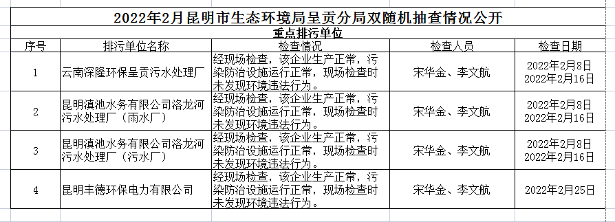 2022年2月昆明市生态环境局呈贡分局双随机抽查情况公开