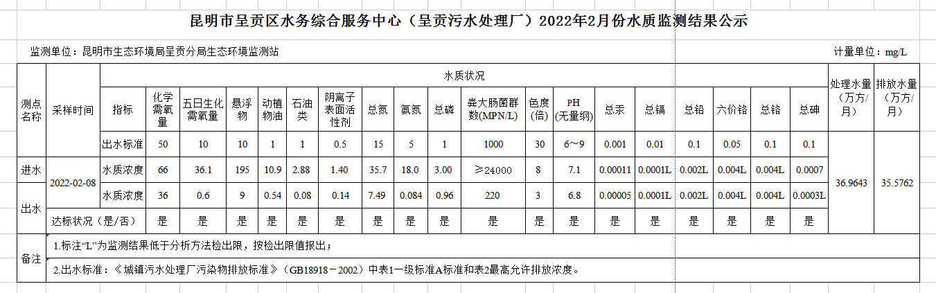 昆明市呈贡区水务综合服务中心(呈贡污水处理厂)2022年2月份水质监测结果公示