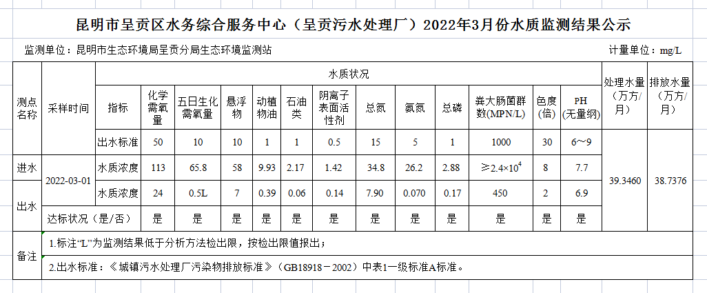 昆明市呈贡区水务综合服务中心(呈贡污水处理厂)2022年3月份水质监测结果公示