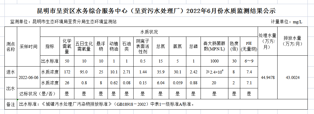 昆明市呈贡区水务综合服务中心(呈贡污水处理厂)2022年6月份水质监测结果公示