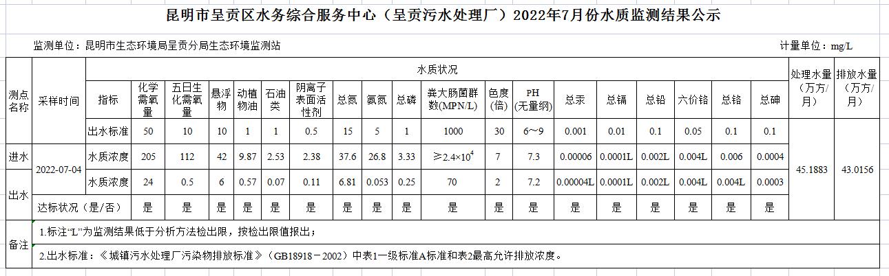昆明市呈贡区水务综合服务中心(呈贡污水处理厂)2022年7月份水质监测结果公示