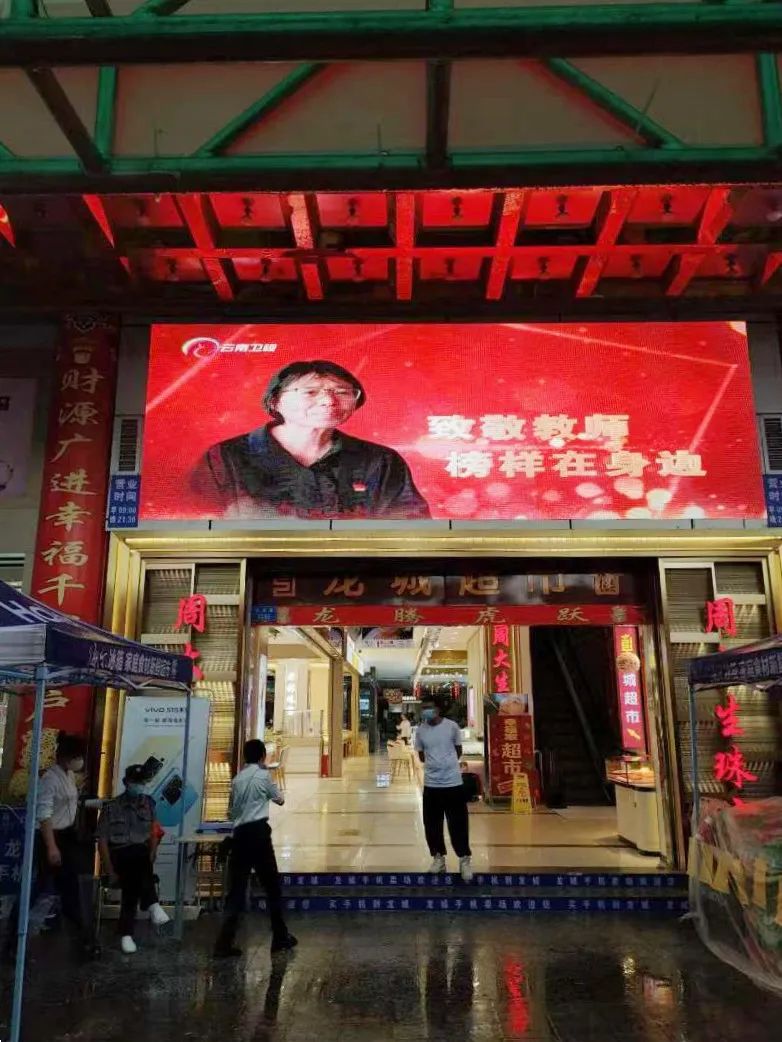 9月9日至10日,在第38个教师节来临之际,呈贡区部分地标性建筑、LED电子显示屏上以字幕滚动、播放尊师重教公益视频等方式为教师亮灯,引导社会各界大力弘扬尊师文化传统,以此感念师恩、礼敬教师。
