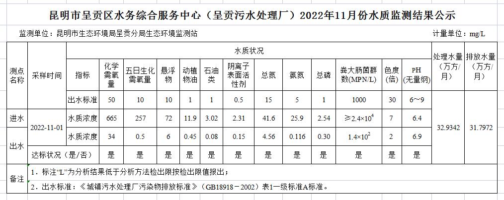 昆明市呈贡区水务综合服务中心(呈贡污水处理厂)2022年11月份水质监测结果公示