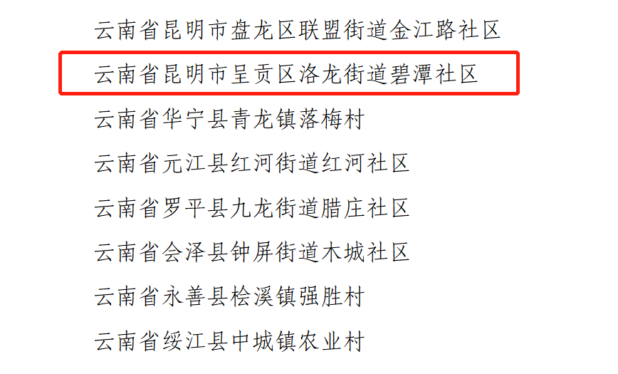 其中,云南省昆明市呈贡区洛龙街道碧潭社区入选。