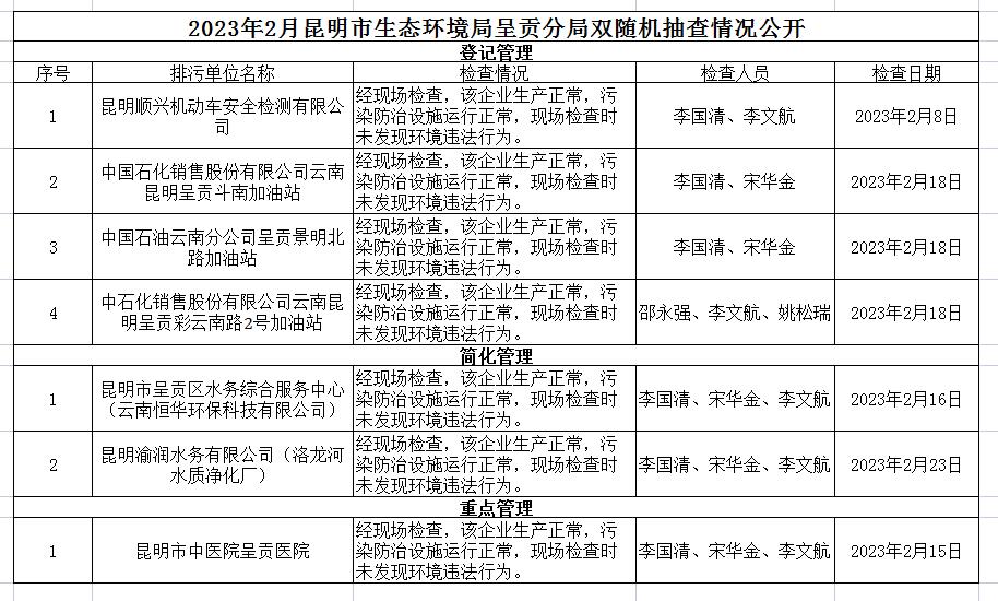 2023年2月昆明市生态环境局呈贡分局双随机抽查情况公开