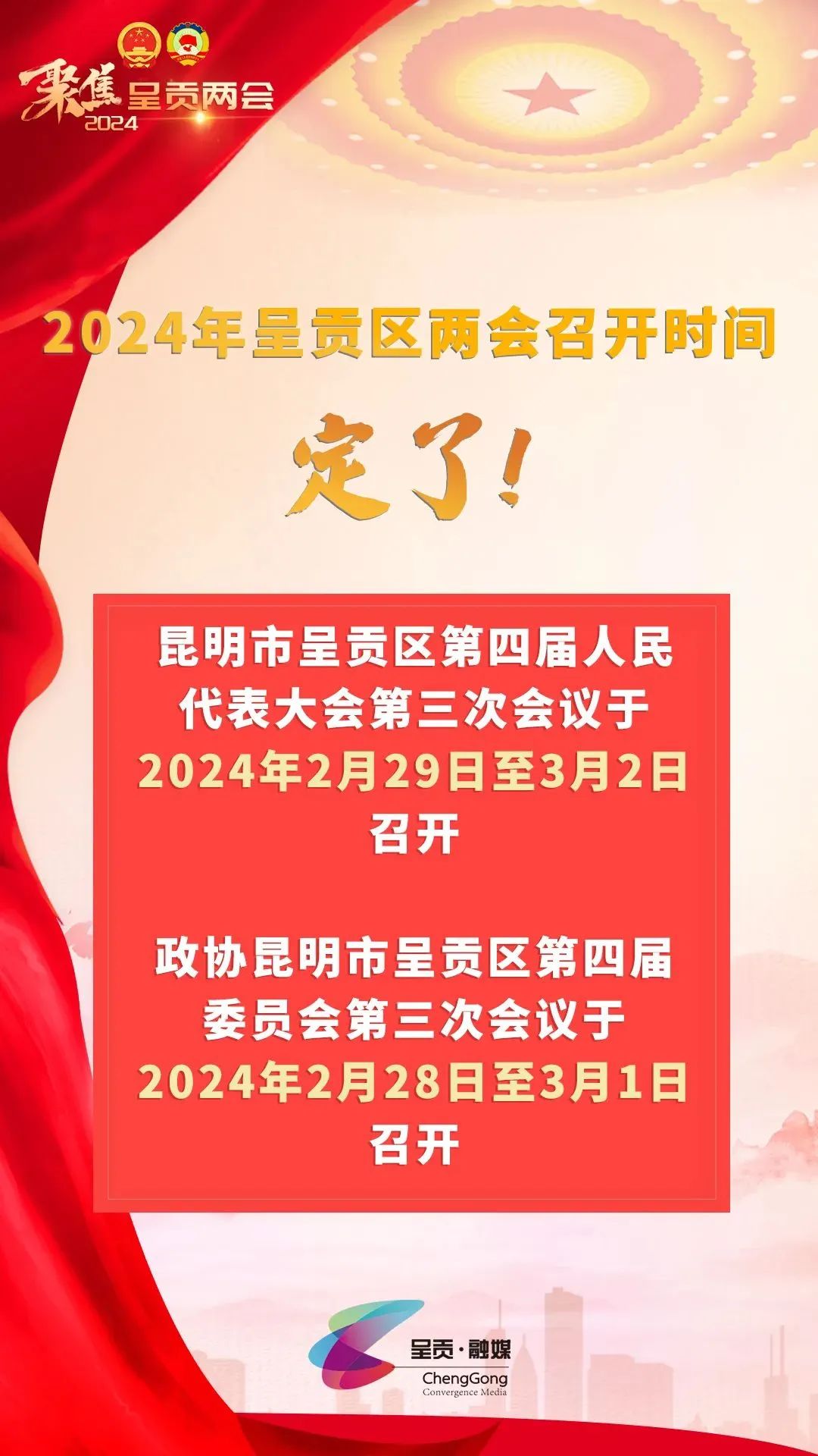 届时,您可以关注微信公众号“呈贡发布”、微博“@呈贡发布”、呈贡融媒App、呈贡发布抖音号、呈贡发布今日头条号等平台,我们将全方位、多视角、深层次为您呈现呈贡两会相关资讯。