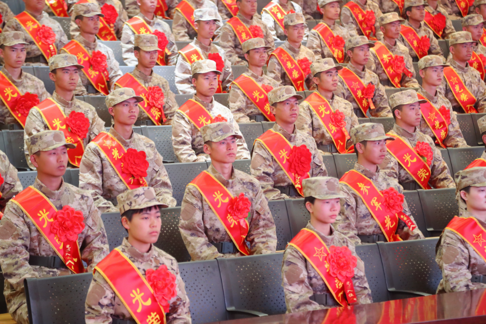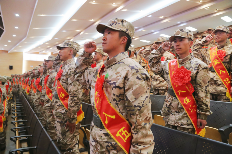 参会领导为新兵代表佩戴光荣花、发放纪念品。全体新兵进行出征宣誓。