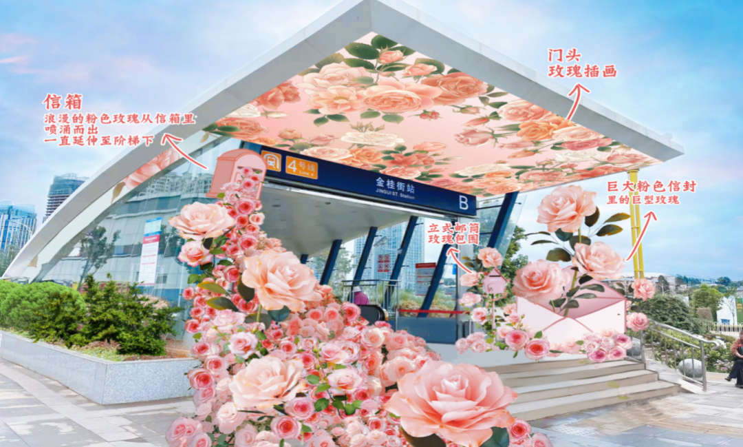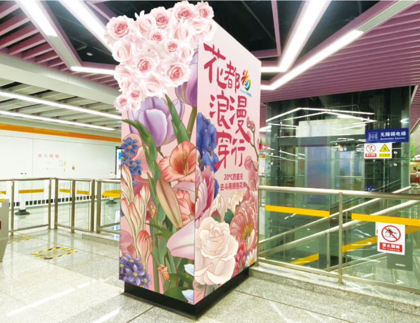 鲜花主题站以地铁4号线“金桂街站”为空间载体,在站厅、B通道、B出口门头以花为主元素布景美陈,在出站直达斗南花卉市场的步行空间里,提前让乘客感受斗南花都浓烈的浪漫。其中,主题站厅和通道内设置美陈打卡点、花样指引路、花墙、花通道、花门头等鲜花布景,营造“浪漫地铁会客厅”,通过一幅幅精美的花卉画面,呈现呈贡斗南花卉的独特之美,让花开在地铁中,人随地铁浪漫穿行在春城中。同时,鲜花主题站还将在地铁1号线“斗南站”内增设“斗南花市”导引指示,让“斗南花市”的形象更加深入人心。