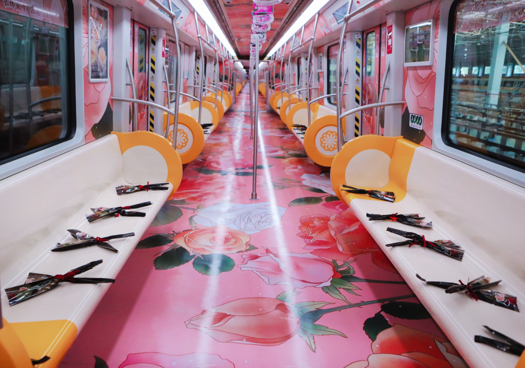 本次主题列车和鲜花主题站以中国传统节日七夕为节点,以玫瑰花为主元素,采取“动+静”结合的方式打造。“动”,以昆明地铁4号线为载体,在车厢内布景装饰,打造一列(6节车厢)鲜花主题列车,让花漾绽放地铁,浪漫穿行城市。“静”,以地铁4号线“金桂街站”为空间载体,在站厅、B通道、B出口门头布景美陈,主题站厅和通道内设置美陈打卡点、花样指引路、花墙、花通道、花门头等鲜花布景,营造“浪漫地铁会客厅”。