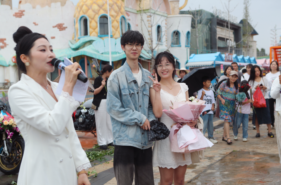 来自安徽的游客濮先生在浪漫的氛围下,手捧鲜花,单膝跪地,在鲜花机车的簇拥和众人的祝福下,向女友深情告白。“我们三年前就是七夕节认识的,很荣幸今天能借文旅城启幕这个活动向我的爱人求婚,我们觉得特别有纪念意义。”濮先生向记者说。